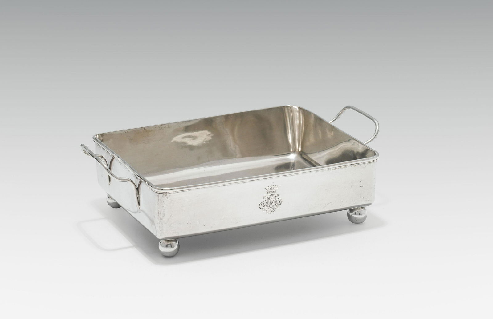 Small roasting Dishsilver; rectangular form, 2 handles, 4 ball feet; crowned monogram on the side;