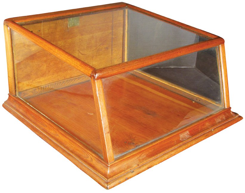SoldSmall Counter Top Slant Front ShowcaseSmall Counter Top Slant Front Showcase with Wooden Base and Door - 20 1/2"W x 11 1/2" D x 11" H In GD Cond. (Great for Miniatures)See Sold Price