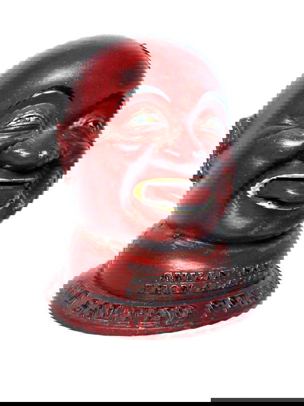 SoldBlack Americana Coin BankDESCRIPTION: A black americana "The Salted Peanut Man, Smilin Sam From Alabam" mechanical coin bank. CIRCA:Mid to late 20th Ct. ORIGIN:USA DIMENSIONS:H:6" x D:4.75" CONDITION: Great condition. See lotSee Sold Price