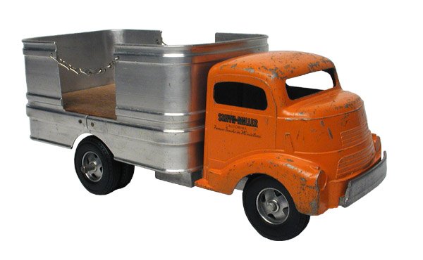 SoldSMITH MILLER 706 MACK MATERIAL TRUCKdie cast & wood, orange, ca 1952, restored w/front bumper repair, C8.See Sold Price