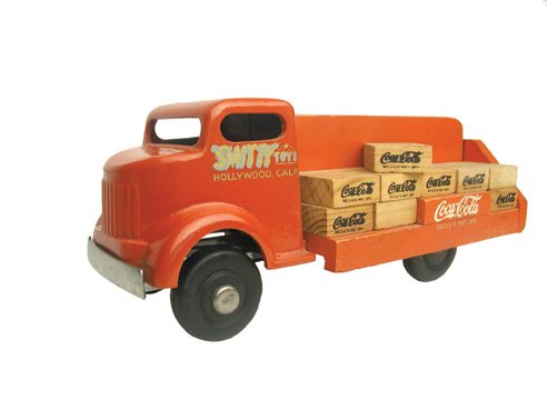 SoldSmith Miller TrucksSmith Miller Coca-Cola Flat Bed Delivery Truck and Smith Miller Smitty Toys Flat Bed Truck, with the Coca-Cola Truck in C7 to C8 and the Smitty Toys Truck in C5 plus to C6 minus.See Sold Price