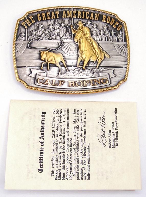 SoldSOLID STERLING "RODEO" BELT BUCKLE CALF125th ANNIVERSARY THE GREAT AMERICAN RODEO CALF ROPING SOLID STERLING SILVER LAYERED WITH 24KT GOLD - 1988 THE HISTORIC PROVIDENSE MINT in ORIGINAL BOX / COA (108 DWT)See Sold Price