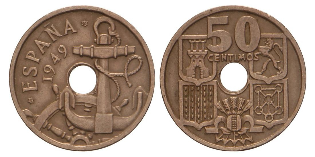 Spain. 50 Centavos. 1949 Arrows pointed downwards.