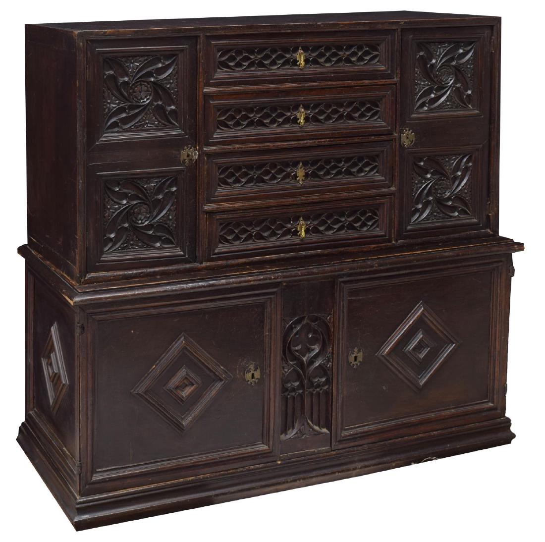 SoldSPANISH BAROQUE STYLE OAK PANELED CABINETSpanish Baroque style oak cabinet, 19th c., molded corner, over case fitted with upper and lower cabinets, opening to interior shelves, three middle drawers, carved foliate motifs, rising on bun feet,See Sold Price