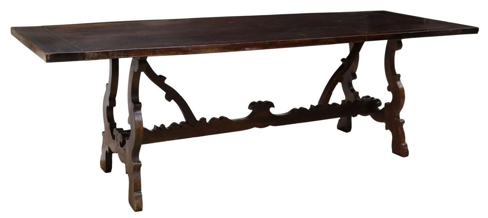 SoldSPANISH BAROQUE STYLE WALNUT TABLEthe rectangular single-plank top raised on a trestle base Condition: marks, scratches and nicks to top. A circular repair to top. 41 inches wide; 24 inches deep; 30 1/2 inches highSee Sold Price