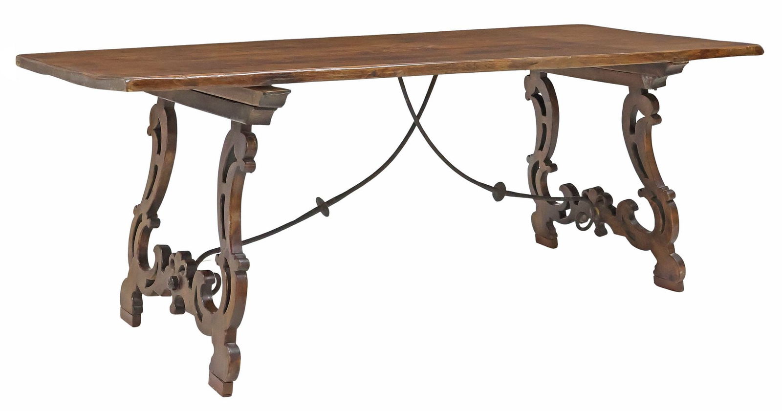 SoldSpanish Baroque Style Walnut Refectory TableSpanish, 19th century. A Baroque style iron mounted walnut refectory table having a 1.25" thick single plank board top raised on shaped trestle supports united by an iron buttress and terminating in sSee Sold Price