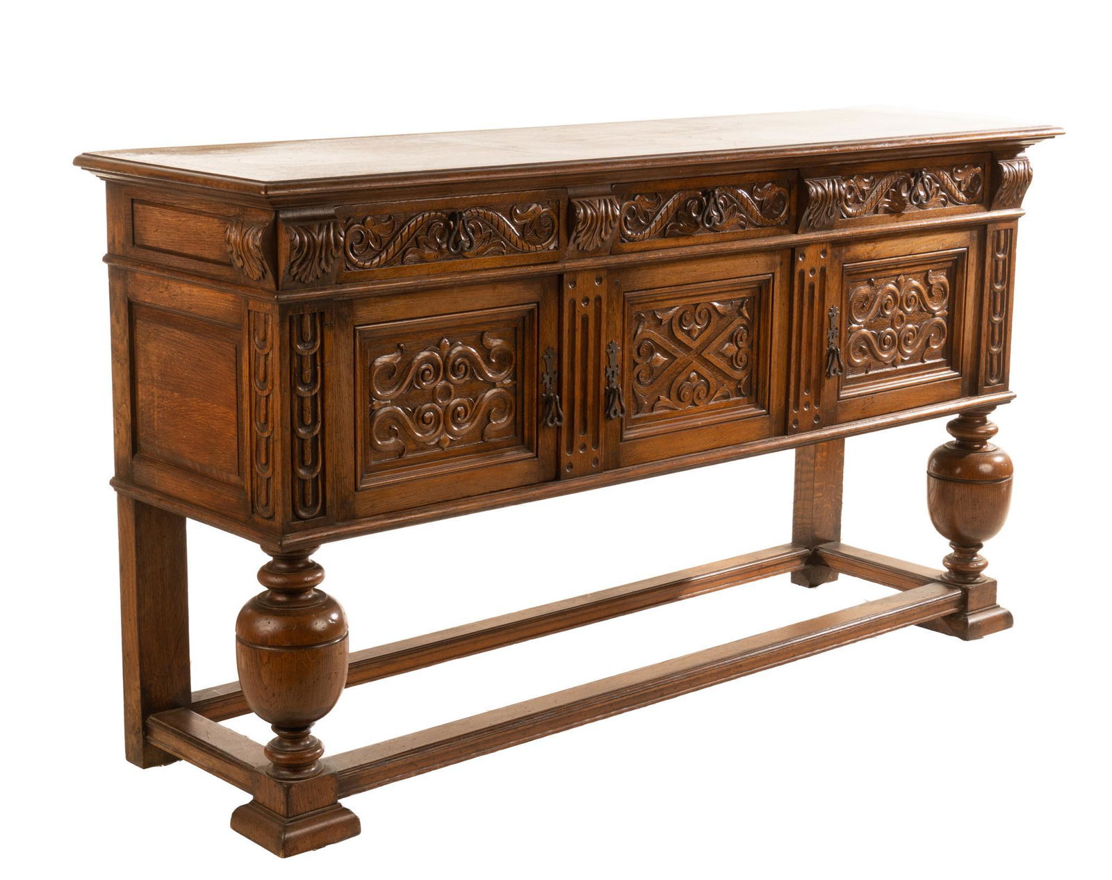 SoldSPANISH STYLE BUFFETLARGE HIGHLY CARVED SPANISH STYLE BUFFET, WEAR TO FINISH. 69" L x 20" D x 29" H. THIS ITEM EXCEEDS SIZE LIMITATIONS FOR IN HOUSE SHIPPING, MUST BE PICKED UP IN HOUSE OR SHIPPED VIA 3rd PARTY GROUND SHSee Sold Price