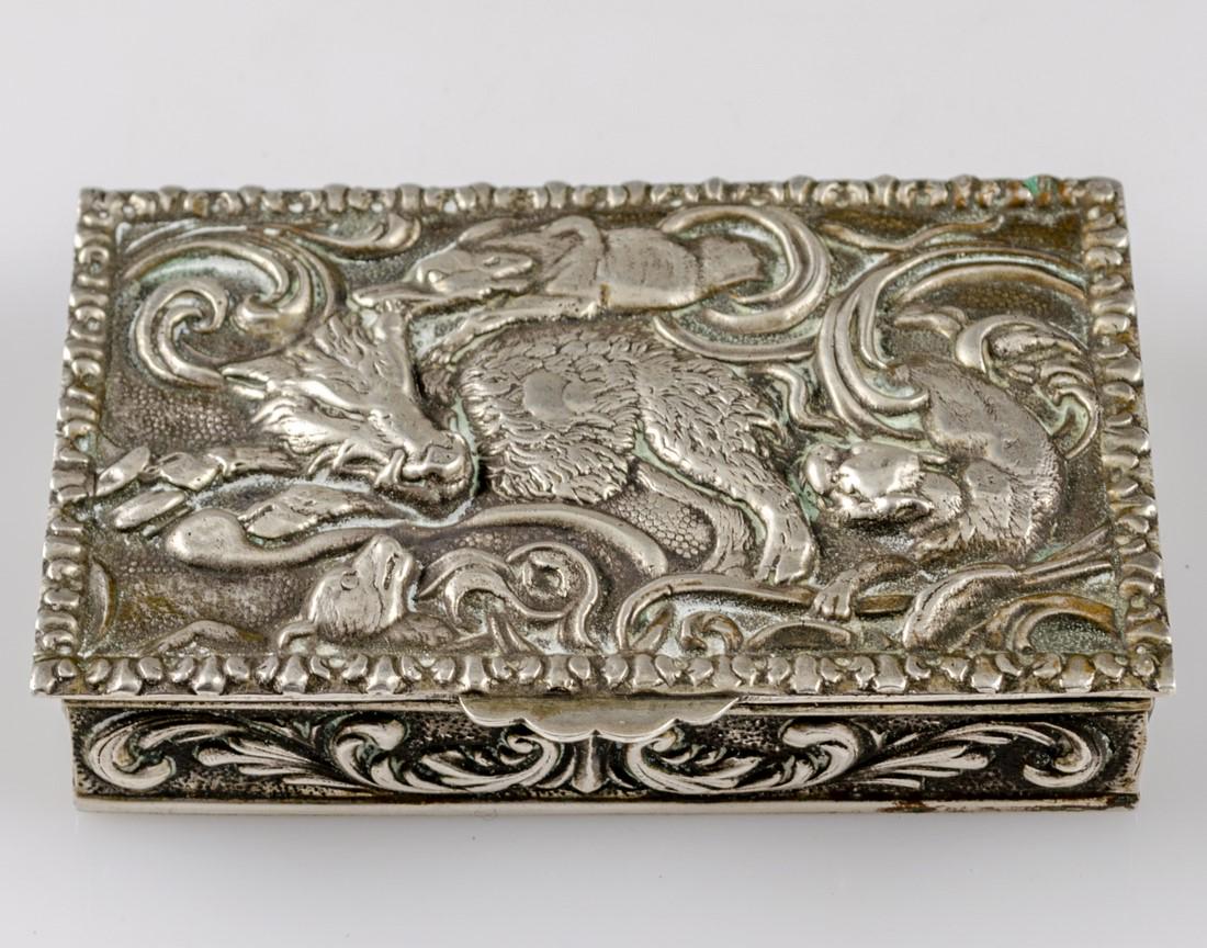 Italian Silver Snuff Boxes5 days LeftEnameled Silver Snuff Box5 days LeftVictorian Sterling Silver Repoussé Trinket Box Putti Garden Scene, London, 1886950 Silver Engraved Snuff Box, c. 1820, B&M Maker's Mark with Clover DeviceMar 08, 2026Marked 800 Silver Card of Cigarette CaseFeb 28, 2026Tiffany Sterling Silver Engraved Box c1900Mar 01, 2026Silver Tobacco Box5 days LeftGerman Silver BoxMar 12, 2026German Silver BoxMar 14, 2026Antique Repousse Sterling Trinket Box864 Lots AwayRussian Silver & Niello Cigarette CaseMar 03, 202619th C. Levi & Salaman Silver & Crystal Snuff Box7 days Left19th Cent. French Sterling Silver Snuff BoxMar 03, 2026Russian Silver Cigarette CaseMar 03, 2026French Silver Snuff Box5 days LeftAntique Russian Silver Cigarette CaseMar 03, 2026