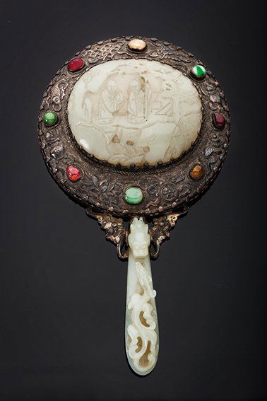 Specchio in argento, pietre preziose e giada incisa e