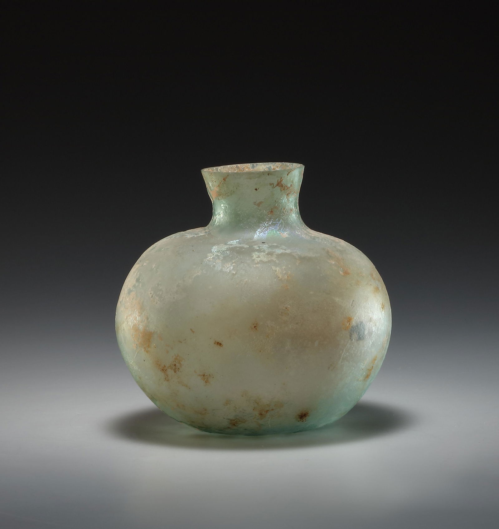 SoldRoman Yellow Glass Spherical Bottle2nd-4th century A.D. Spherical, slightly squat body with dimpled underside to base; short, flared cylindrical neck; deposits remaining in the interior, and iridescence to the exterior. Cf. The MetropoSee Sold Price