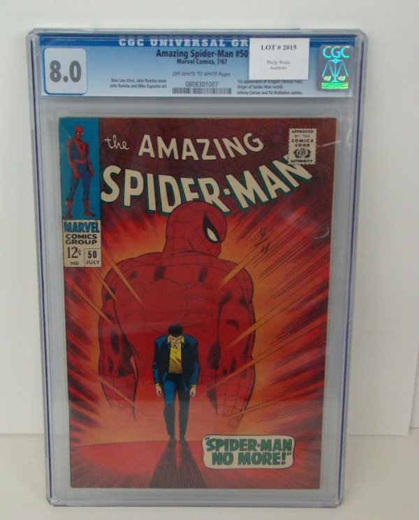 SoldCGC Graded 4.0 Amazing Spider-Man #50 Comic BookCGC Graded 4.0 Off-White to White Pages. Amazing Spider-Man #50 Comic Book - Super Key Issue 1st appearance of Kingpin, Origin retold, Johnny Carson and Ed McMahon Cameo. Stan Lee Story, John Romita aSee Sold Price
