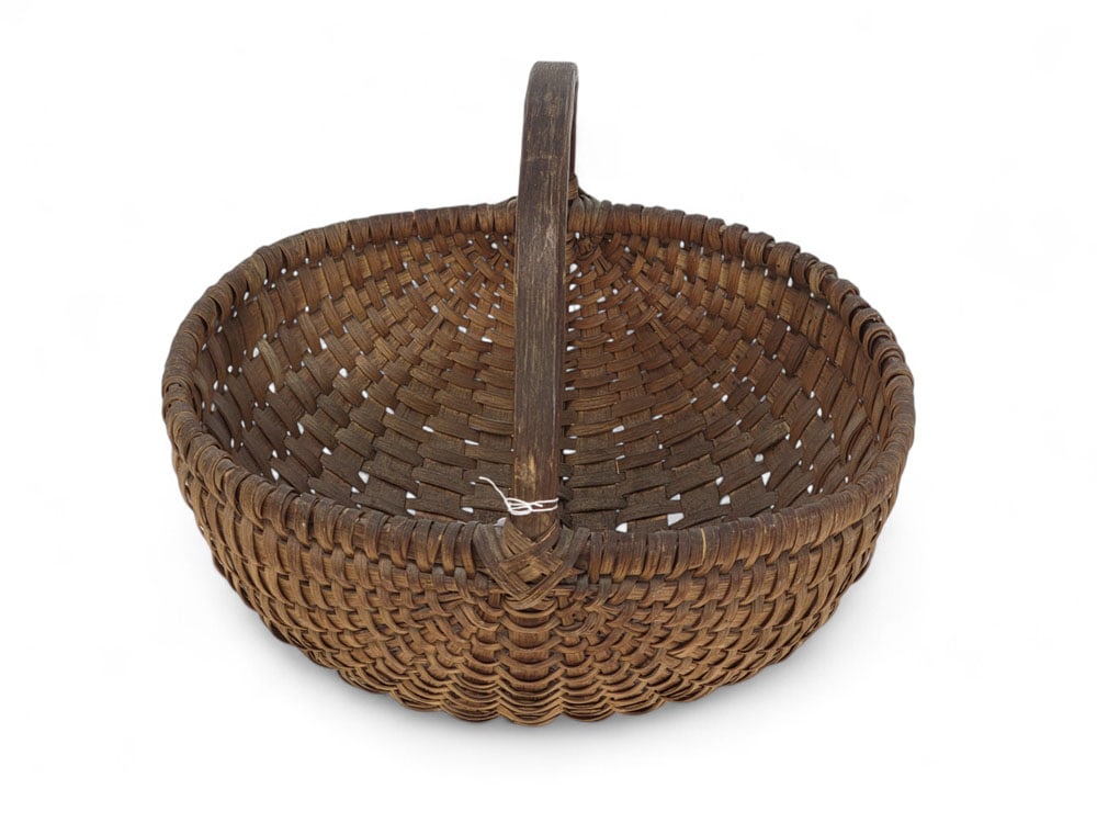 SoldEARLY SPLINT WOVEN BASKETEARLY SPLINT WOVEN BASKET, TWO NOTCHED BOW HANDLES, 20.5 IN DIAMETERSee Sold Price