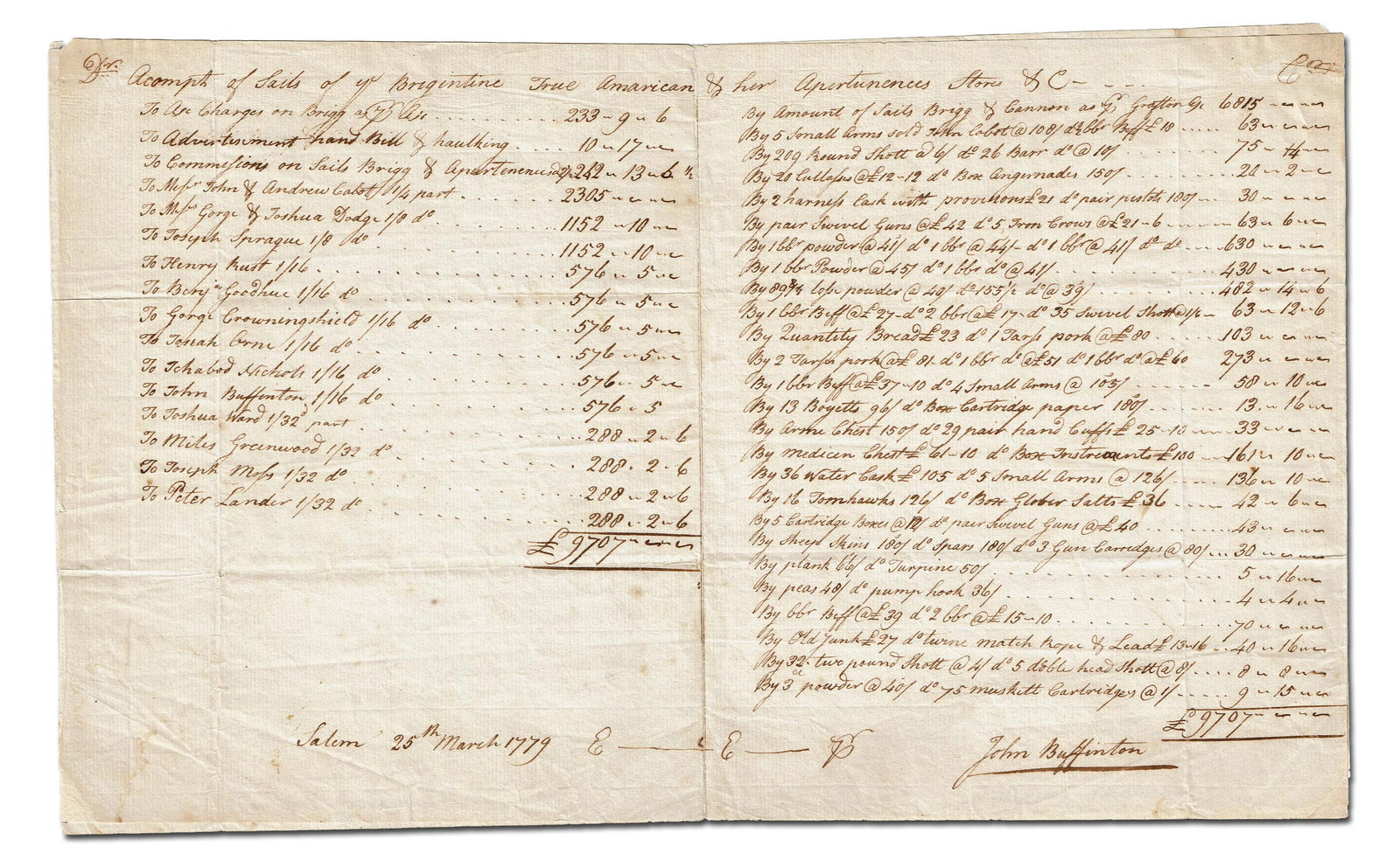 Spoils Taken by the Revolutionary War Privateer, "True American," & List of Investors in the Venture