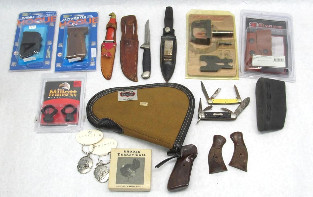 LOT OF 5: COLT AND BONANZA HUNTING KNIVES.May 14, 2026LOT OF ASSORTED FIREARMS STOCKS & ACCESSORIES.Apr 18, 2026Estate lot of (2) BUCK folding knives in leather case, small folding made in Pakistan knife, larger5 days LeftLarge Collection of Early Tools - Woodworking, Planes, etcApr 16, 2026NINE WORLD WAR FIGHTING KNIVES & BAYONETS.Apr 17, 2026Lot Of Vintage Muzzleloading And Pioneer Woodsmen ItemsApr 18, 2026LOT 4 KNIVES WITH DECORATIVE HANDLESApr 28, 2026LOT 4 KNIVES WITH DECORATIVE HANDLESApr 28, 2026FIXED BLADE & FOLDING POCKET KNIVES5 days LeftFOLDING POCKET KNIVES by BUCK, COLT & SCRADE5 days LeftHUNTING KNIVES by DEER CREEK & SCHRADE5 days LeftA Large Collection of Gunsmithing and Ammunition Reloading EquipmentMay 03, 2026Lot of Tools5 days LeftGrouping of 5 Folding & Hunting Knives - Schrade, Ozark Trail, & More6 days LeftLARGE GROUP OF FRONTIER SIDE KNIVES AND BUTCHERApr 19, 2026An Assortment of Leather and Synthetic Firearm Accessories Including Slings Holsters and a HuntingMay 02, 2026
