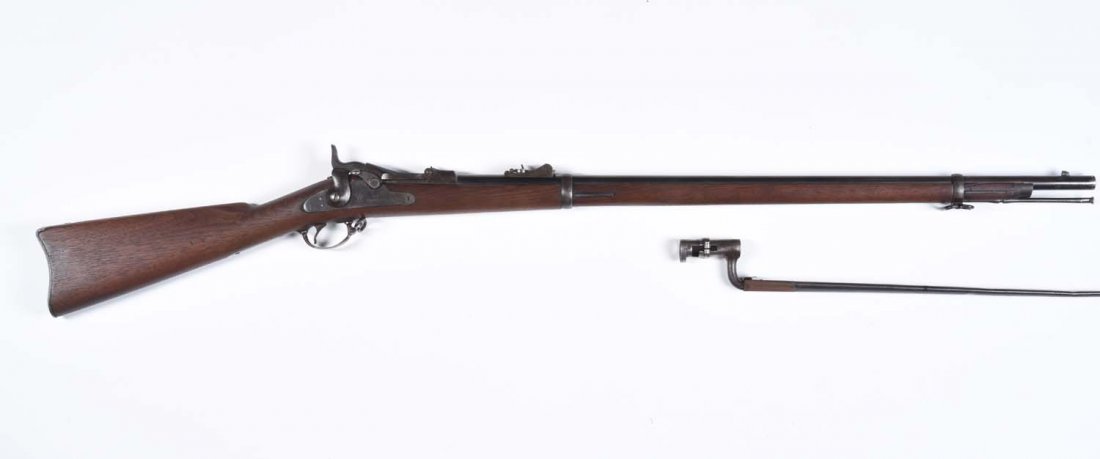 Sold1864 US SPRINGFIELD MUSKET & BAYONETUS Model 1864 Springfield Trapdoor breech-loading musket, percussion fire, 45 caliber (no serial number - many of the 1866 trapdoors were issued without the SN). Trapdoor stamped 1866 with inspector mSee Sold Price