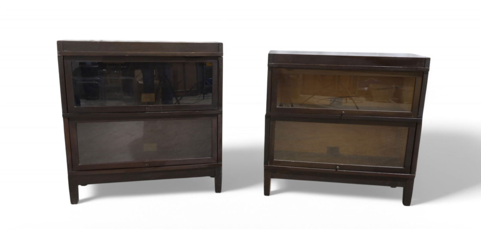 Sold2 Oak 3 stack barrister bookcases in as found estate condition, 1 has worse finish than the other,2 Oak 3 stack barrister bookcases in as found estate condition, 1 has worse finish than the other, with flaking, white paint drops on top, 1 is Macy the other is Globe Warnecke, both have no bases, thSee Sold Price
