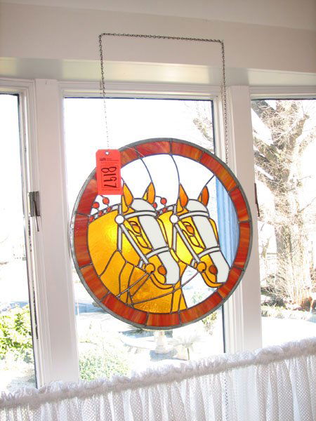 STAIN GLASS DISPLAY WITH 2 DRAFT HORSES