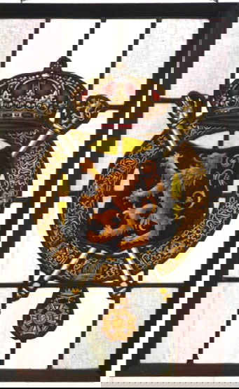 SoldLEADED STAINED + ENAMELED GLASS PANEL, 18.5" X 12"LEADED STAINED + ENAMELED GLASS PANEL, 18.5" X 12"See Sold Price