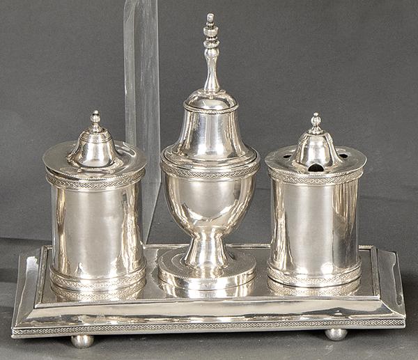 Lot Silver Plate ItemsMar 04, 20262 pc Lot Victorian Meriden & Rogers Silverplate Cruet Condiment CastorsFeb 28, 2026BOIN-TABURET, FABERGE - 8pc. FRENCH ANTIQUE 950 STERLING SILVER TEA SET + 6 FABERGE ESPRESSO CUPS !Silver writing set, European school, 19th century5 days LeftFive American Sterling Silver Table ArticlesMar 13, 2026Three English Silver Serving and Table ObjectsMar 13, 2026Rococo Style Silver Plate Coffee And Tea Set (7-piece), C. Mid-late 20th Century6 days LeftChristofle "Malmaison" Covered Serving Dishes, 3Mar 05, 2026Antique 925 Sterling Silver Floral Chased Ink Well with Crystal Insert2 days LeftDGH Goldsmith Handwrought Sterling Silver Tea Set 4pc Grape Motif20 hrs LeftBailey, Banks & Biddle Queen Anne Sterling Tea Set7 days LeftCasa Prieto 3pc Mexican Sterling Silver Pumpkin Coffee Set20 hrs LeftFive Silverplate Table Articles including English Covered Serving Dishes and Others23 hrs LeftZarmella Argenti .800 Silver Saint Mark Cruet Set with Crystal Bottles7 days LeftGeorg Jensen Ornamental #724 Sterling Silver 3pc Condiment SetMar 03, 2026PAIR OF NICKEL PLATED CLOCKWORK TIME LAMPS Late 19th/Early 20th Century Heights 12".Mar 04, 2026