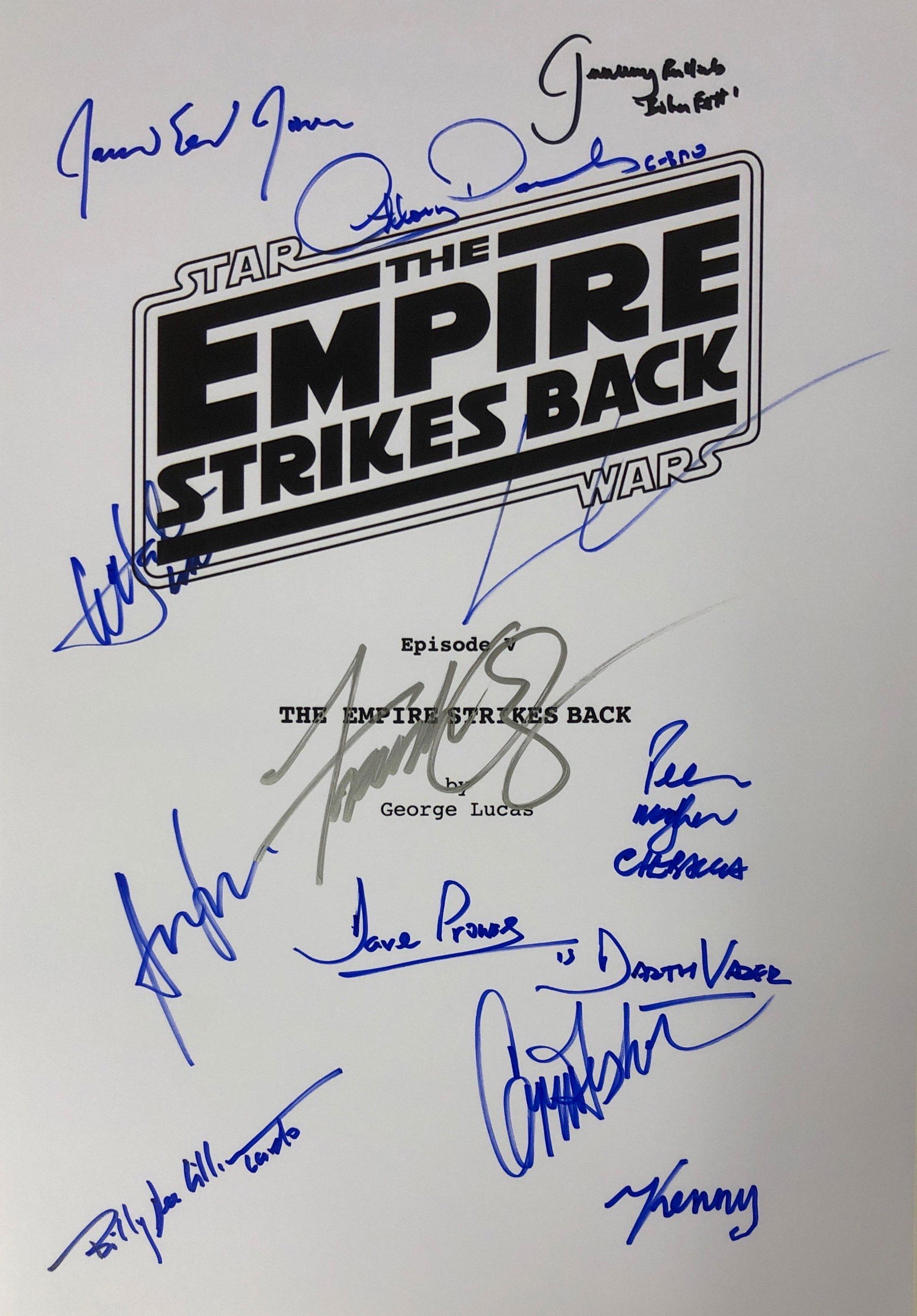 SoldStar Wars: The Empire Strikes Back Signed ScreenplayStar Wars: The Empire Strikes Back. Screenplay autographed by Mark Hamill, Carrie Fisher, Anthony Daniels, Harrison Ford & Kenny BakerSee Sold Price