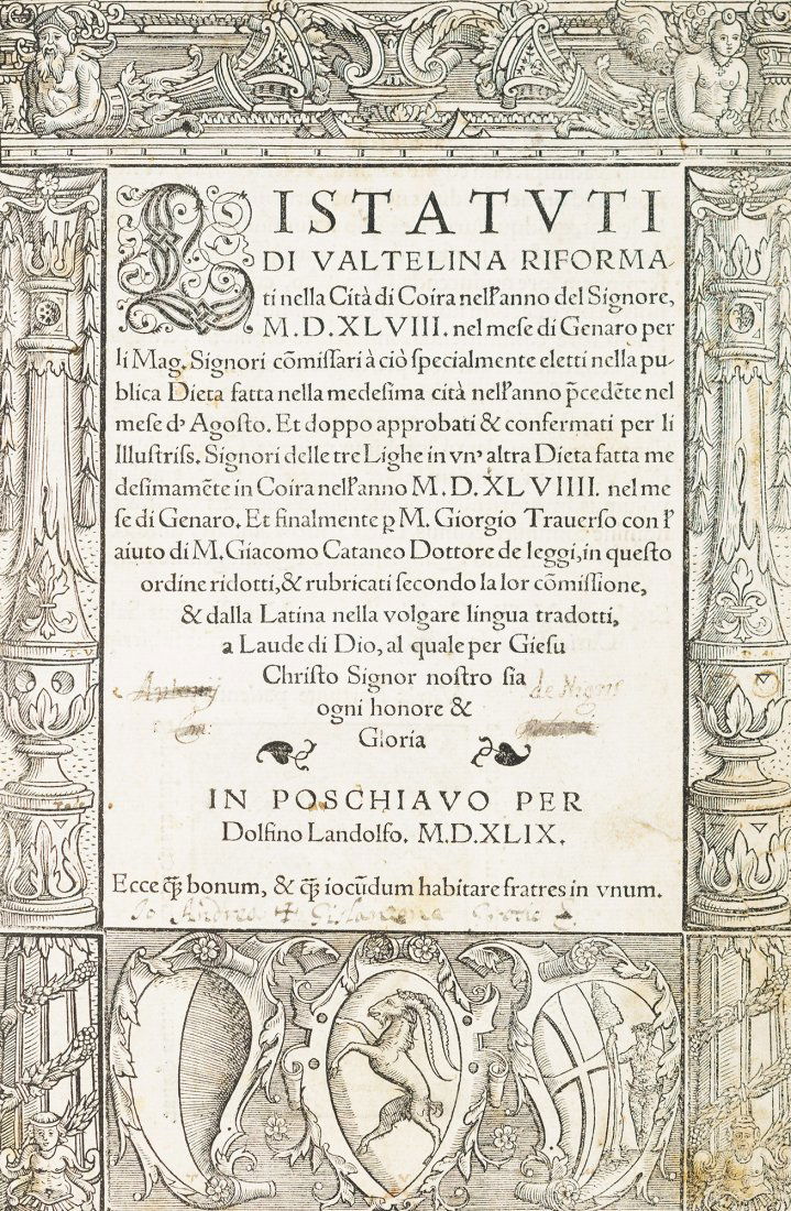 Sold[Bergamo] Ricci, Statuta civitatis Bergomi, 1727RARE EDITION OF THE STATUTES OF BERGAMO RICCI, BERNARDINO. Statuta magnificae civitatis Bergomi cum correctionibus, reformationibus, & aliis decretis, additis de ordine mag. d. d. Jo: Baptistae PetriSee Sold Price
