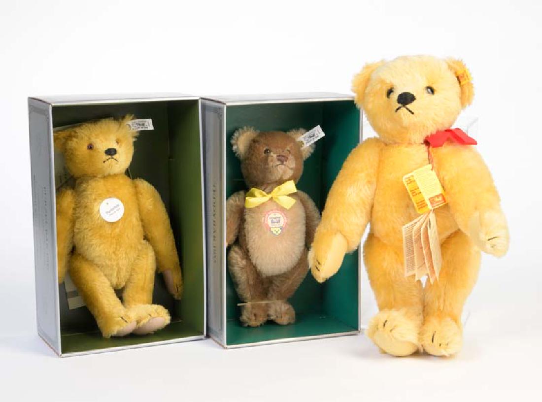 SoldSTEIFF Konv. 3 Bären, unbespielt, mit Knopf, Schild u.STEIFF Konv. 3 Bären, unbespielt, mit Knopf, Schild u. Fahne, 1x Dickie Replika 1930, 32 cm, von 1985, 1x Zotty, 30 cm, 1x Classic-Teddy, Replika von 1928, 48 cm, mit Stimme German Description STEIFFSee Sold Price