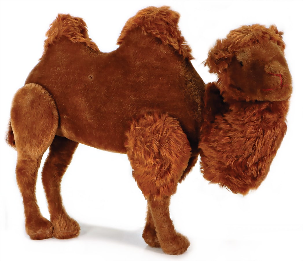 STEIFF camel, produced 1908, item No. 5343, hand sample piece produced without button, chest label
