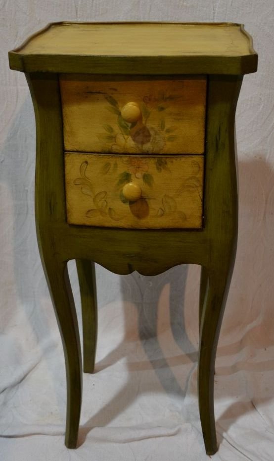 SoldFrench Two Drawer Satin Wood Stand w Floral Paint Decoratedca. 1930's French two drawer stand with two drawers on cabriole legs and paint decorated by The Weiman Company of Chicago Illinois. See label on underside as shown. Measuring approx 9.5" tall x 17" wiSee Sold Price