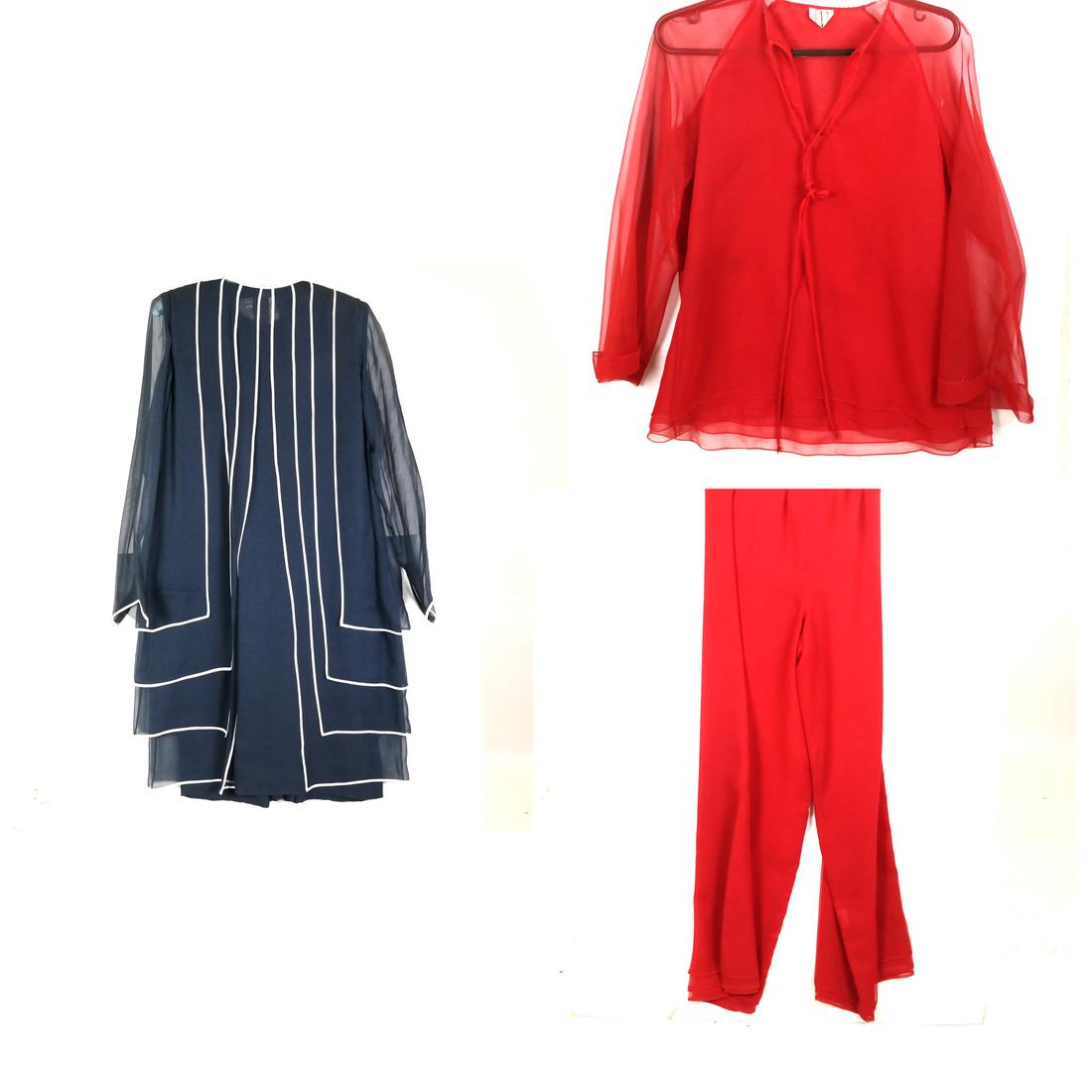 SoldStephen Burrows 2-Piece Outfit and an Unmarked DressComprises: 1.) a two-piece Stephen Burrows silk organza top and pants. Finished measurements: Bust - 38in, Hip - 37in. In good vintage condition. 2.) an unmarked blue silk chiffon multi-layered dressSee Sold Price