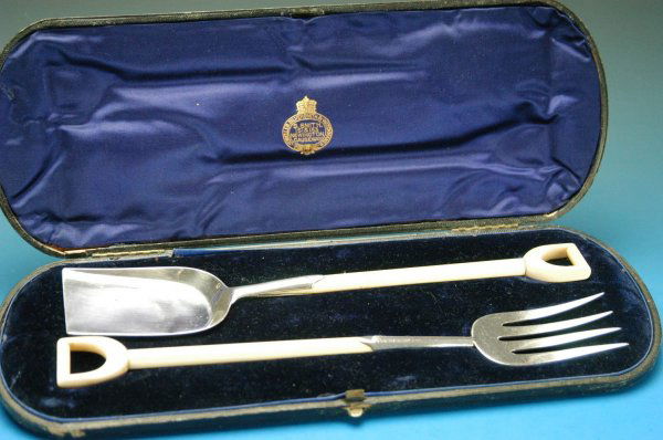 Sterling and bone serving fork & shovel.