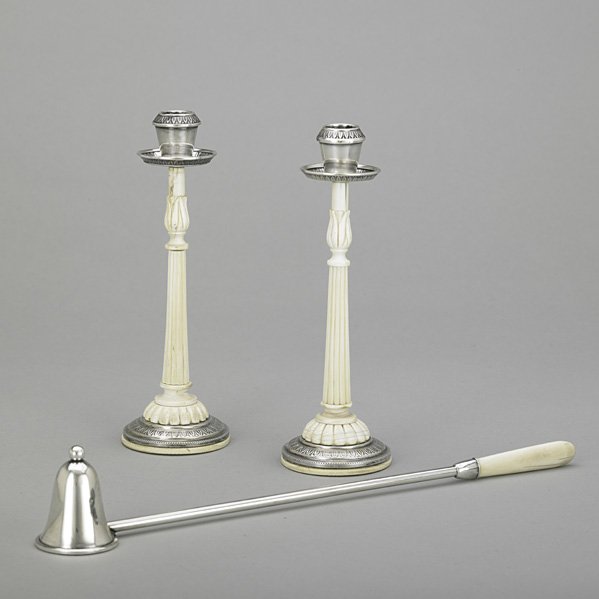 STERLING AND IVORY CANDLESTICKS AND SNUFFER