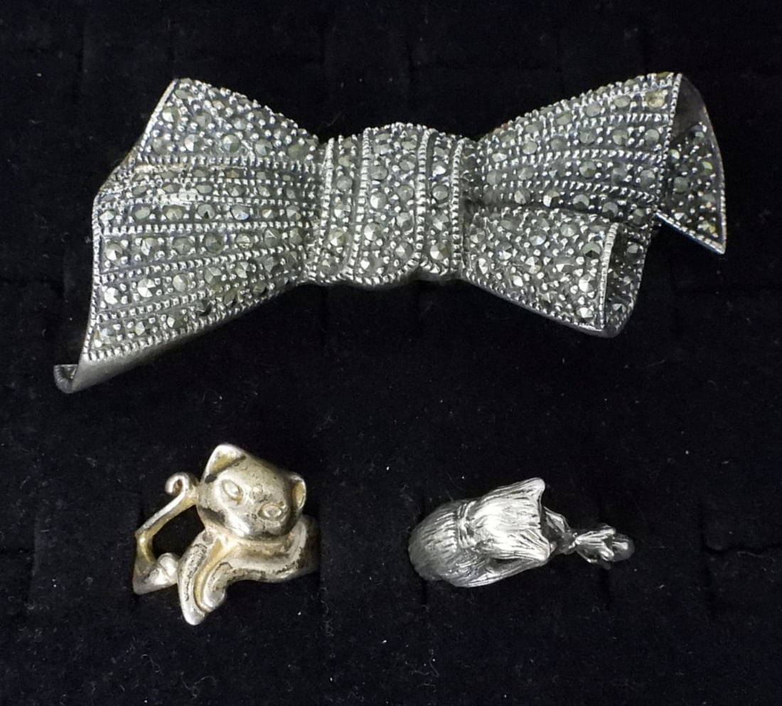 STERLING CAT RINGS & BOW BROOCH