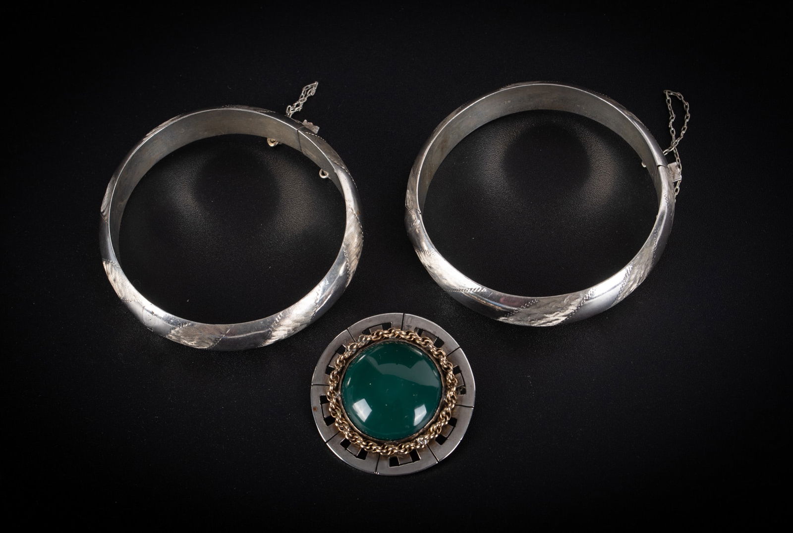 Sterling Engraved Bangles plus a Mexican Sterling Brooch