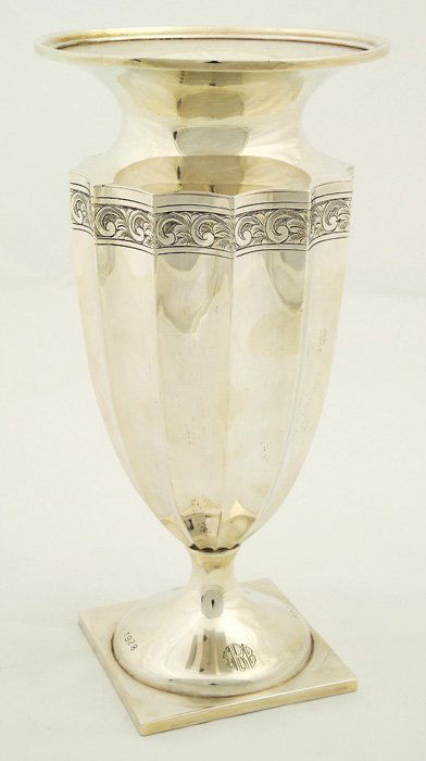 SoldA MONUMENTAL STERLING SILVER FLOWER VASE BY WHITING115. A MONUMENTAL STERLING SILVER FLOWER VASE BY WHITING. US circa 1930. Richly decorated in Baroque design. 20" tall. 1117.7 grams.See Sold Price