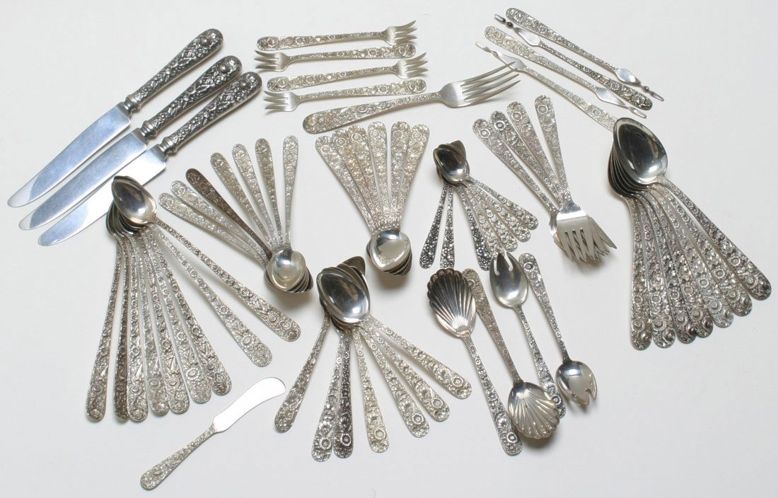 120+ Pc Lot Sterling Flatware, Rogers & Gorham5 days LeftLot Of Six Mixed Sterling Silver Flatware ItemsFeb 28, 20269PC LOT OF STERLING SILVER, 22 T.O.W.Mar 07, 2026Large lot of sterling silver and silver handled utensils. To include: Durgin serving fork and spoonMar 01, 2026Assorted Silverplate Flatware and Serving Pieces, 12 PiecesMar 07, 2026REED & BARTON "Mirrorstele" Sterling Silver Flatware, Service for 105 days LeftSterling Silver Handled Estate Serving FlatwareFeb 24, 2026S. Kirk & Son Repousse pattern sterling silver 13pc. flatware and serving pieces, 14.630ozt. 74 days LeftS Kirk & Son Sterling "Repousse" Flatware ServiceFeb 26, 202651 Pieces Sterling Repousse Style FlatwareFeb 25, 2026S. KIRK STERLING FLORAL REPOUSSÉ FLATWARE, 84PCS.Feb 25, 2026Kirk & Sons "Repousse" sterling flatware setFeb 24, 2026Lunt Monticello pattern sterling silver flatware and serving pieces, 25pc., 19.482ozt. 10"Long x 14 days LeftGROUP OF VARIOUS-PATTERNED SILVER FLATWARE, 2682gFeb 25, 2026800 SILVER DESSERT FRUIT FLATWARE SET4 days Left800 silver cutlery setFeb 26, 2026