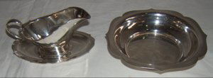SoldSterling silver 3-piece table setSterling silver three-piece table set. Center dish, 11.5" diameter, and two footed dishes, 3"h. 38 troy oz.See Sold Price