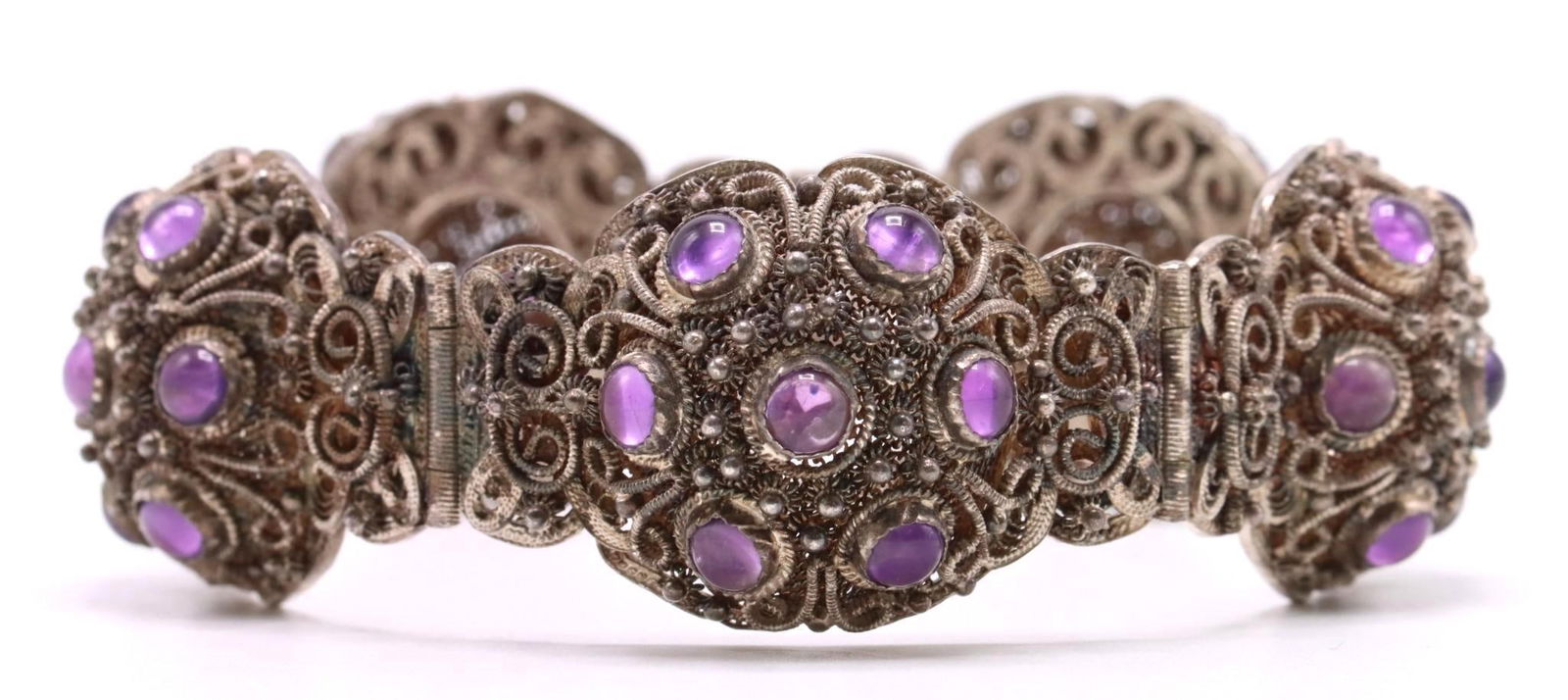 SoldAntonio Pineda Sterling Silver Amethyst BraceletAntonio Pineda (Mexican, 1919-2009) hand-wrought sterling silver bracelet featuring a linked series of bezel-set oval cabochon amethyst stones. Each amethyst displays a rich violet hue with natural vaSee Sold Price