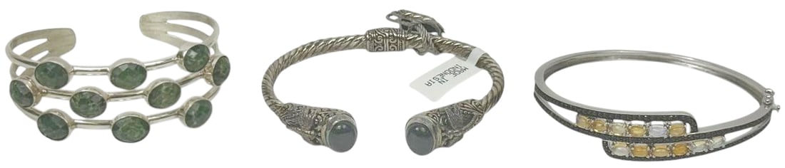 Jolene Eustace (Cochiti, act. since 1980s) Sterling Silver Bangle Bracelets, Ring, and Earrings withJolene Eustace (Cochiti, act. since 1980s) Sterling Silver Bangle Bracelets, Ring, and Earrings with 14K Gold Accents lot of 4, all marked JAE STERLING 14K, includes: a pair of matching slender bangle