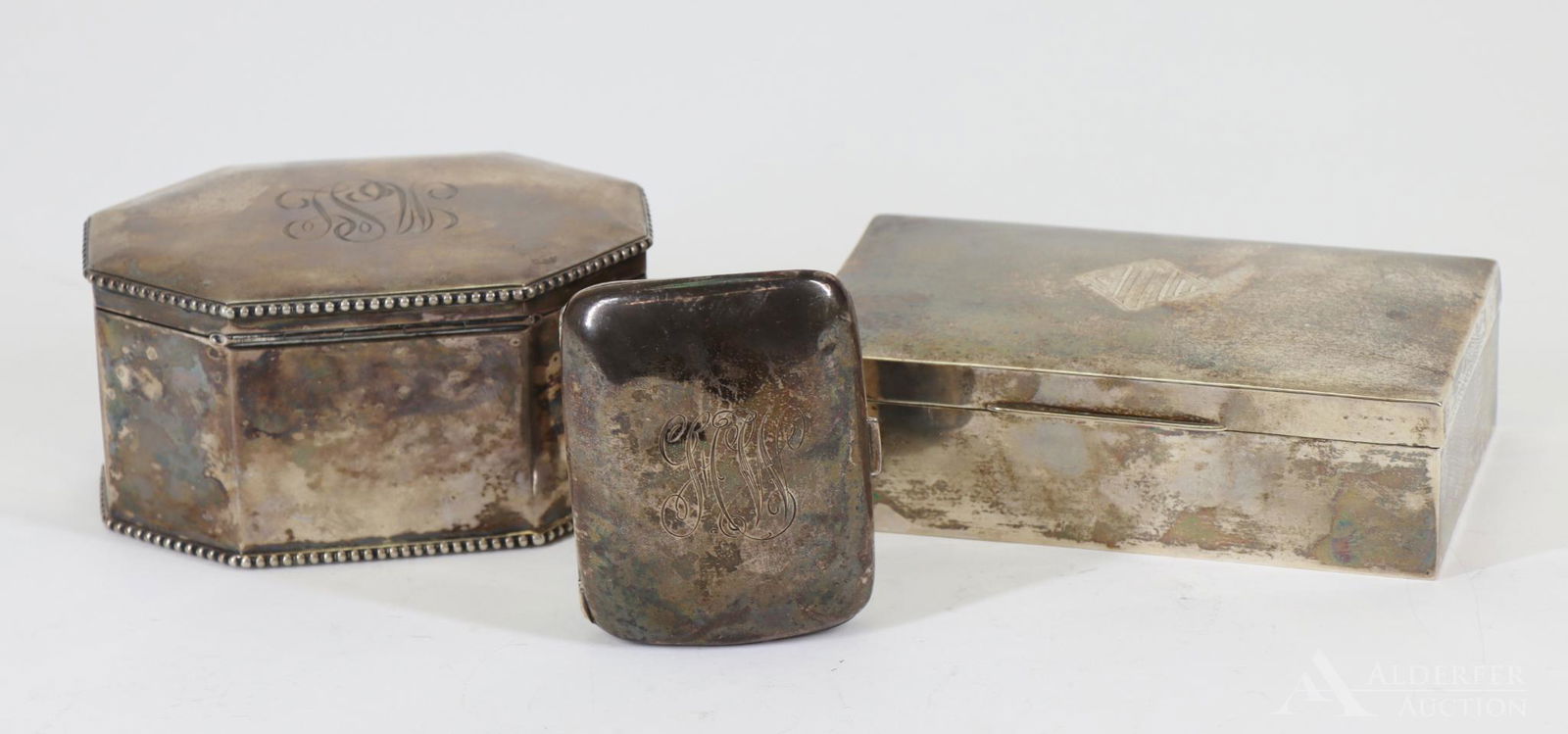 Reed & Barton & Others Flatware Boxes 4pc LOTFeb 26, 2026Lot of sterling silver dresser accessories, including various covered glass jars and scent bottles.Mar 01, 2026Antique Silver Chinese Matchboxes9 hrs Left(2) JAPANESE LACQUERED MOTHER-OF-PEARL INLAID TABLE BOXESFeb 21, 2026(4) COLLECTION OF CARVED WOOD, INLAID & LEATHER-CLAD TABLE BOXESFeb 21, 2026Vintage Silver Plate Jewelry BoxMar 10, 2026Three silver cigarette boxes,A silver cigarette box, Birmingham, 1944Two Sterling Silver Boxes and a Tortoiseshell BoxFeb 24, 2026Two Sterling Silver BoxesFeb 24, 2026(3) SMALL SILVER MOUNTED BOXESFeb 20, 2026THREE SILVER MOUNTED TABLE BOXES5 days LeftFour Engraved Silver Cigarette Cases and Compacts35 mins LeftA selection of silver, Late 19th / early 20th century,Four Baroque style sterling silver vanity boxesMar 03, 2026Two Vintage Fruit-Decorated Tin BoxesFeb 28, 2026