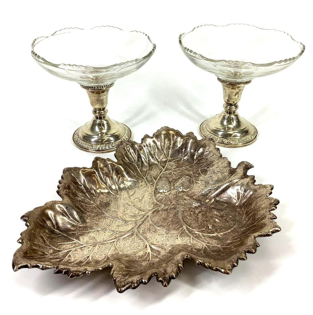 SoldSterling Silver Footed CompoteTogether with two silver plated and Lenox dishes, silverplated covered vegetable and tray. Also including eight silver plated flatware and four demi-tasse spoons. Apx. 8 t.o. 3"h x 7"dia.See Sold Price