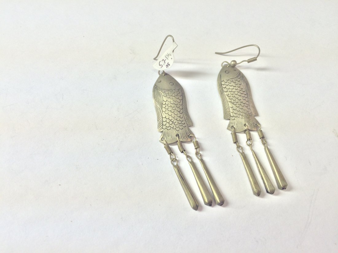 sterling silver dangling earrings with fish design.