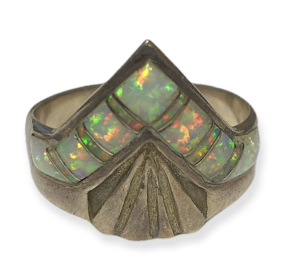 SoldRay Jack Sterling Silver Multi-Stone Inlay Arrow RingSterling Silver| Ray Jack Sterling Silver Multi-Stone Inlay Arrow Ring| Genuine Jet, Turquoise. Spiny Oyster and Lab Opal| Measures 2.25" x 1/2" Wide| Signed| Weighs 26.4 Grams| Size 8| Native AmericaSee Sold Price