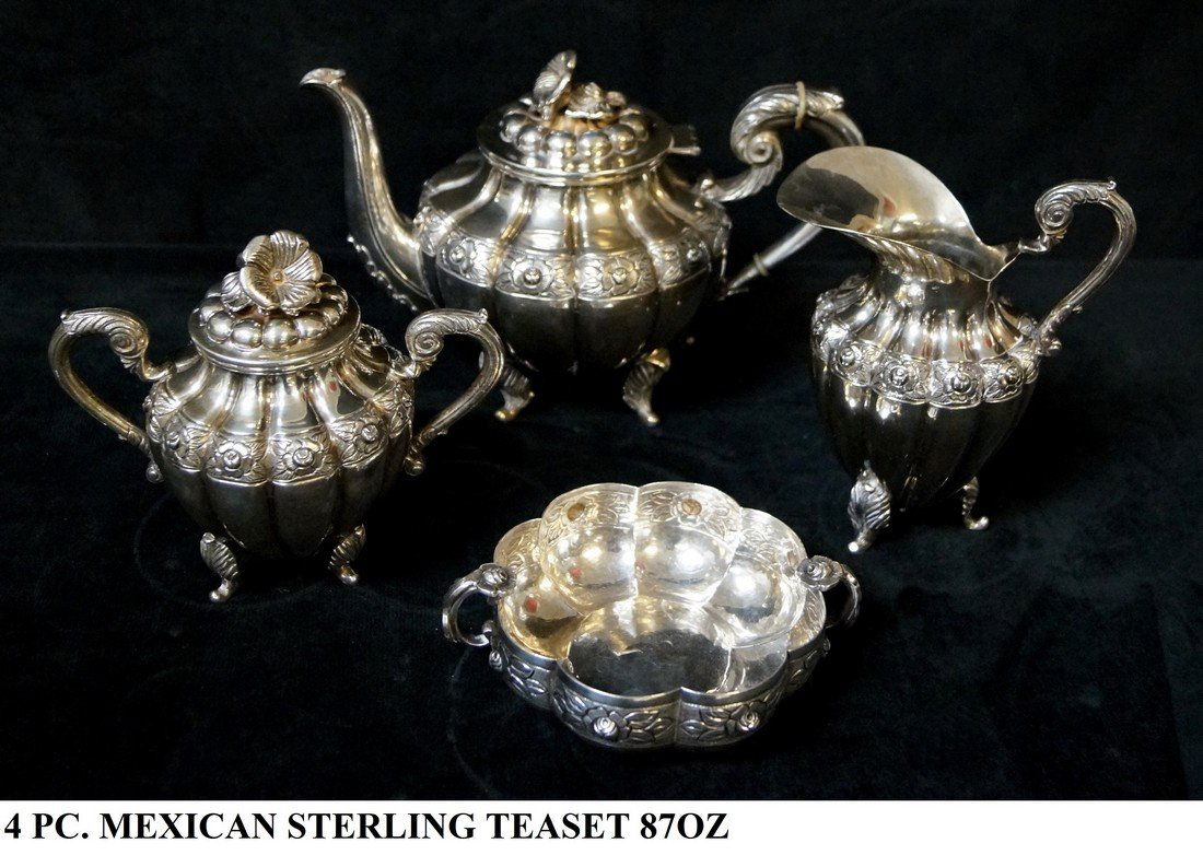 SoldMID 20TH C. MEXICAN STERLING SILVER TEA SET - 5 PC SETMID 20TH C. MEXICAN STERLING SILVER TEA SET - 5 PC SET Mid 20th century five-piece Mexican sterling silver tea set. Includes: Tea pot, 9" Creamer dish, 5" Sugar jar, 4.5" Waste pot, 2.75" Tray, 24.7See Sold Price