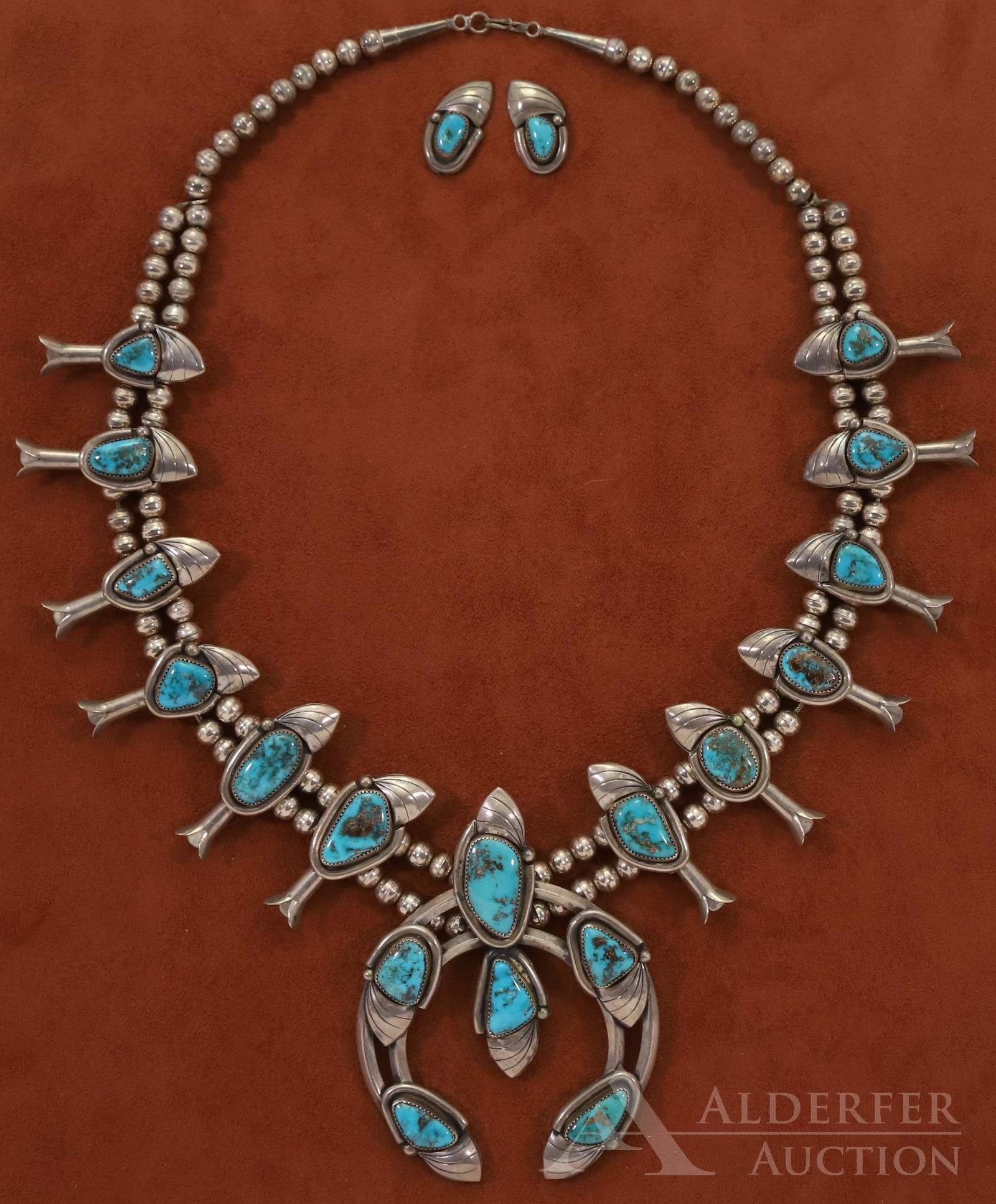 SoldNative America Navajo Sterling Silver Turquoise Squash Blossom Necklace & Earring's Set.This is a Native America Navajo Sterling Silver Turquoise Squash Blossom Necklace & Earring's Set. Necklace length: 24.00"See Sold Price