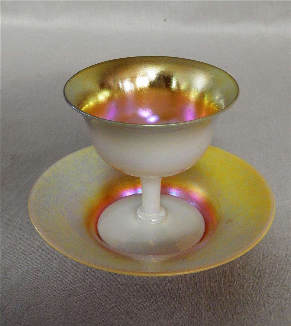 SoldSteuben Aurene And Calcite Sherbet And UnderplateDESCRIPTION: Steuben aurene and calcite sherbet and matching underplate. Reference: Variant of shape 2960 pictured on p. 216 of The Glass Of Frederick Carder by Paul V. Gardner CIRCA: 1903-1932 ORIGINSee Sold Price