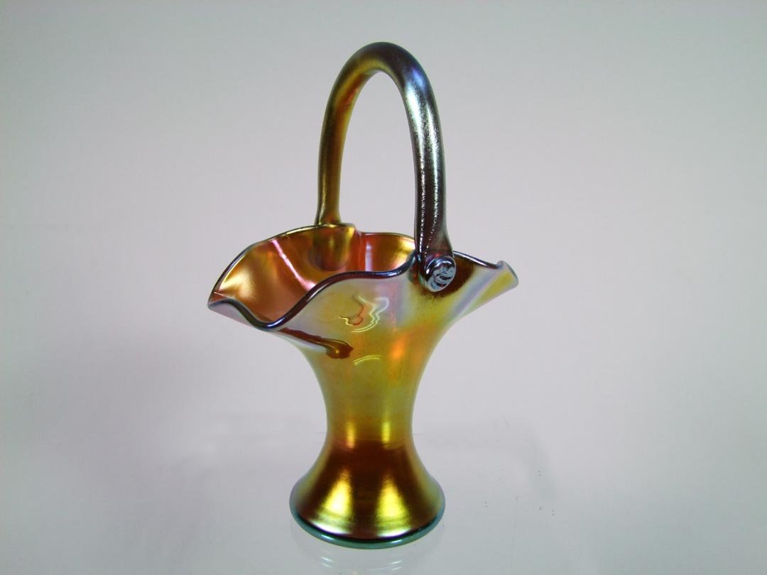 SoldSteuben Glass Gold "Aurene" Iridescent BasketSteuben Glass Gold "Aurene" Iridescent Basket20th Century, American.Steuben glass gold "Aurene" iridescent basket with handle. Marked on base by etching "Aurene" and "2881".Reference: CSC-20273Shape:See Sold Price