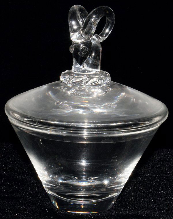 STEUBEN GLASS RAM'S HEAD COVERED CANDY DISH,