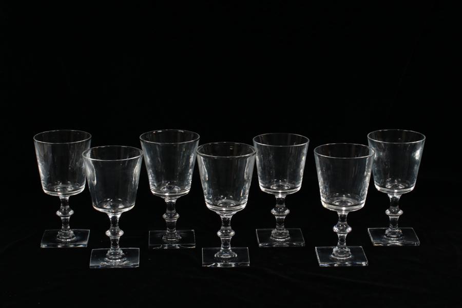 STEUBEN SQUARE BASE WATER GOBLETS, SEVEN H 7"