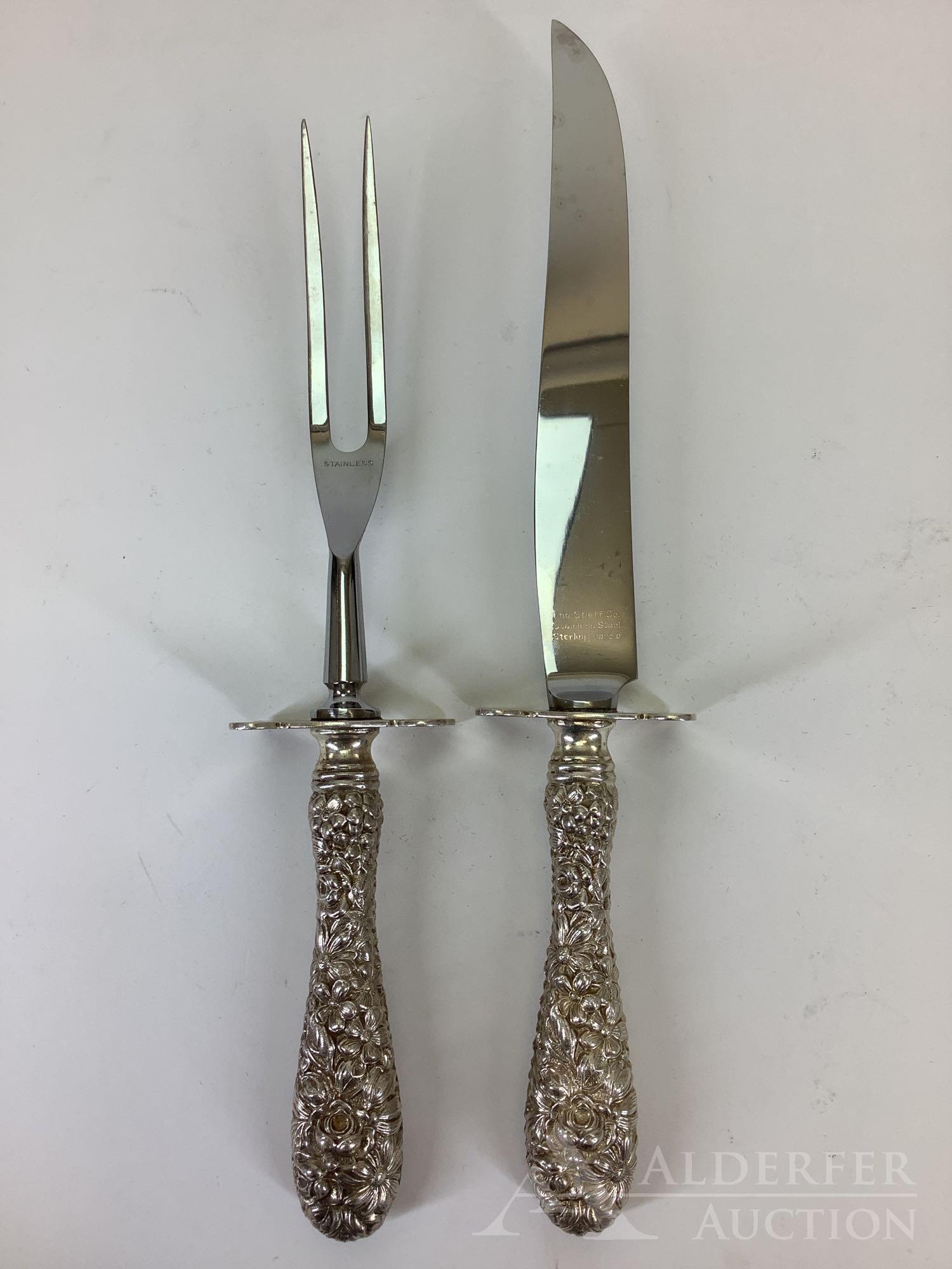 SoldSteiff Co. Sterling Silver Handled Carving SetOrnate repousse floral design. Marked The Stieff Co. Stainless Steel Sterling Handle. From a Boca Raton estate. Local Pick Up or Third Party Shipping Required.See Sold Price