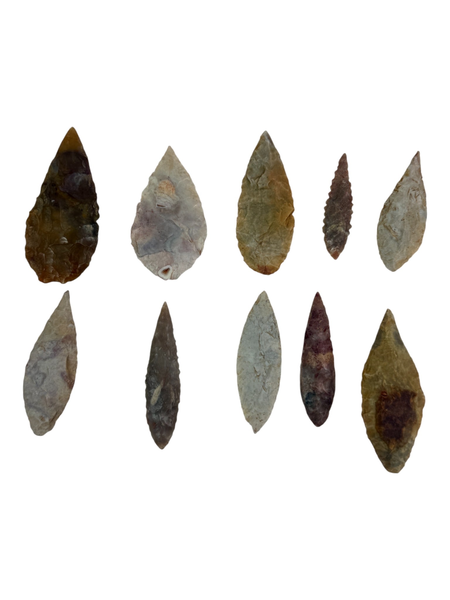 SoldStone Neolithic Arrowhead Point GroupGroup of elongated stone projectile points and blades. Mixed coloration and material types. Condition shows wear and patination.See Sold Price